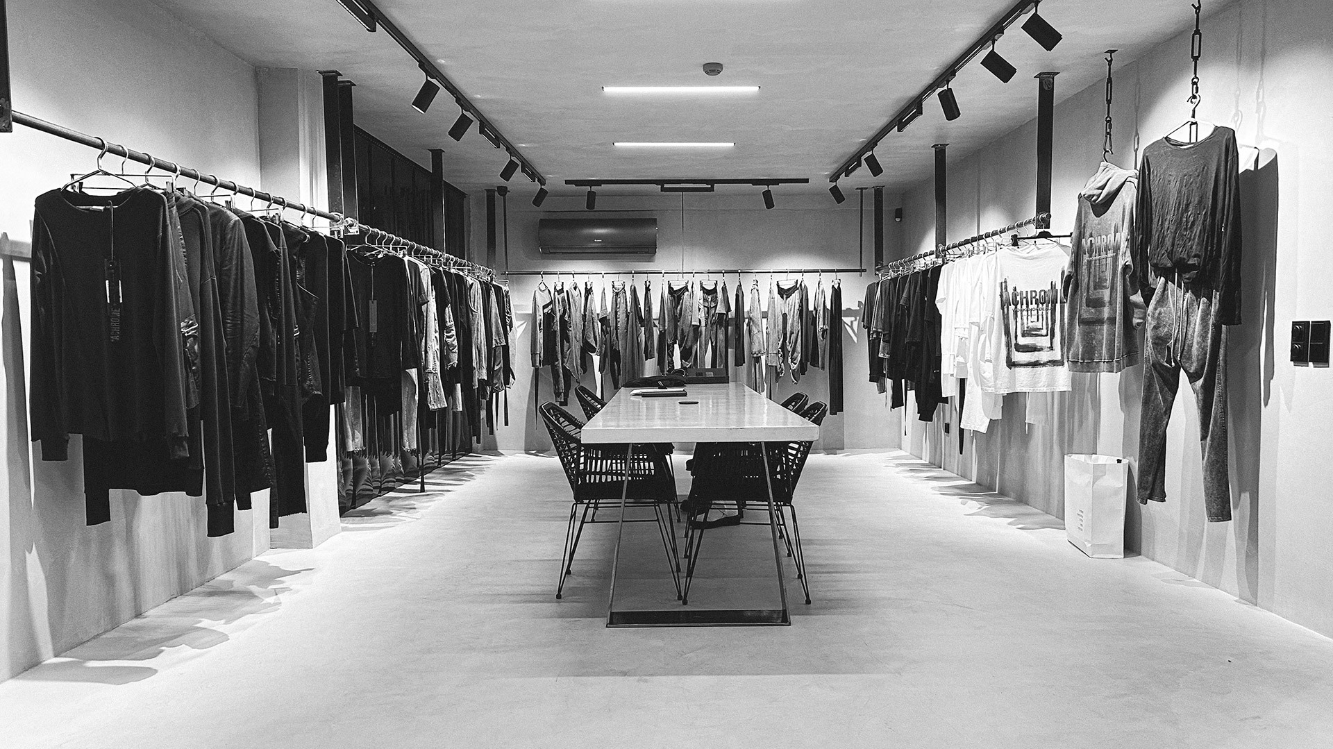 HIGHLY TEXTURED CONCRETE WALLS ARE THE BOUNDARIES AND FLOATING HANGING RAILS RESEMBLE THE FEELING OF ANOTHER UNKNOWN WORLD, YET TO BE DISCOVERED.